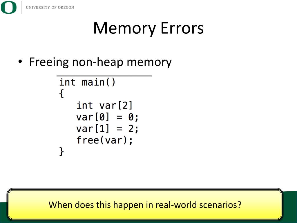 Memory Errors • Freeing non-heap memory When does this happen in real-world scenarios?