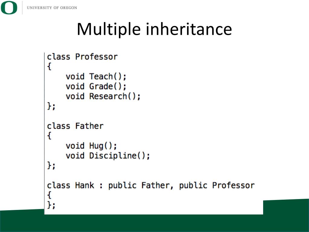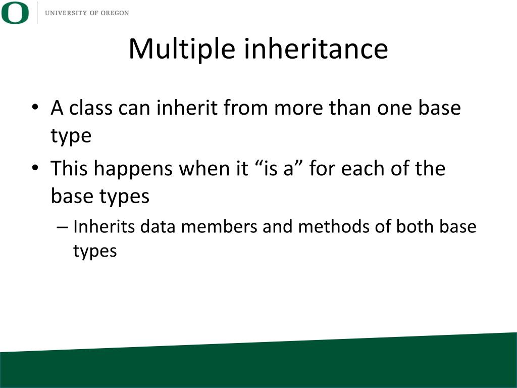 Multiple inheritance • A class can inherit from more than one base type • This happens when it “is a” for each of the base types • Inherits data members and methods of both base types