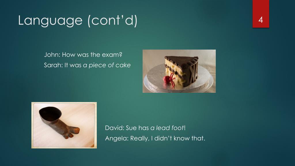 Language (cont’d) John: How wastheexam? Sarah: Itwasa piece of cake David: Sue has a leadfoot! Angela: Really, I didn’tknowthat.