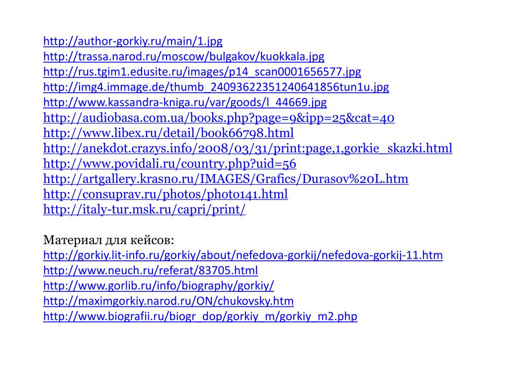 http://author-gorkiy.ru/main/1.jpg http://trassa.narod.ru/moscow/bulgakov/kuokkala.jpg http://rus.tgim1.edusite.ru/images/p14_scan0001656577.jpg http://img4.immage.de/thumb_24093622351240641856tun1u.jpg http://www.kassandra-kniga.ru/var/goods/l_44669.jpg http://audiobasa.com.ua/books.php?page=9&ipp=25&cat=40 http://www.libex.ru/detail/book66798.html http://anekdot.crazys.info/2008/03/31/print:page,1,gorkie_skazki.html http://www.povidali.ru/country.php?uid=56 http://artgallery.krasno.ru/IMAGES/Grafics/Durasov%20L.htm http://consuprav.ru/photos/photo141.html http://italy-tur.msk.ru/capri/print/ Материал для кейсов: http://gorkiy.lit-info.ru/gorkiy/about/nefedova-gorkij/nefedova-gorkij-11.htm http://www.neuch.ru/referat/83705.html http://www.gorlib.ru/info/biography/gorkiy/ http://maximgorkiy.narod.ru/ON/chukovsky.htm http://www.biografii.ru/biogr_dop/gorkiy_m/gorkiy_m2.php