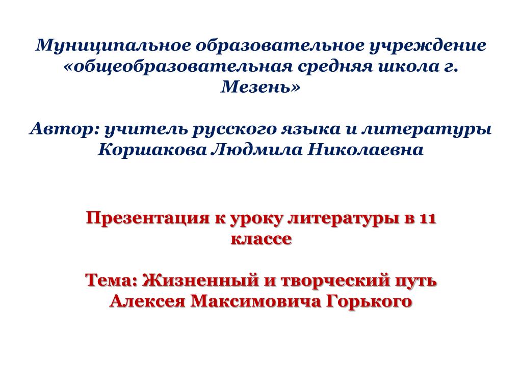 Муниципальное образовательное учреждение «общеобразовательная средняя школа г. Мезень» Автор: учитель русского языка и литературы Коршакова Людмила Николаевна Презентация к уроку литературы в 11 классе Тема: Жизненный и творческий путь Алексея Максимовича Горького