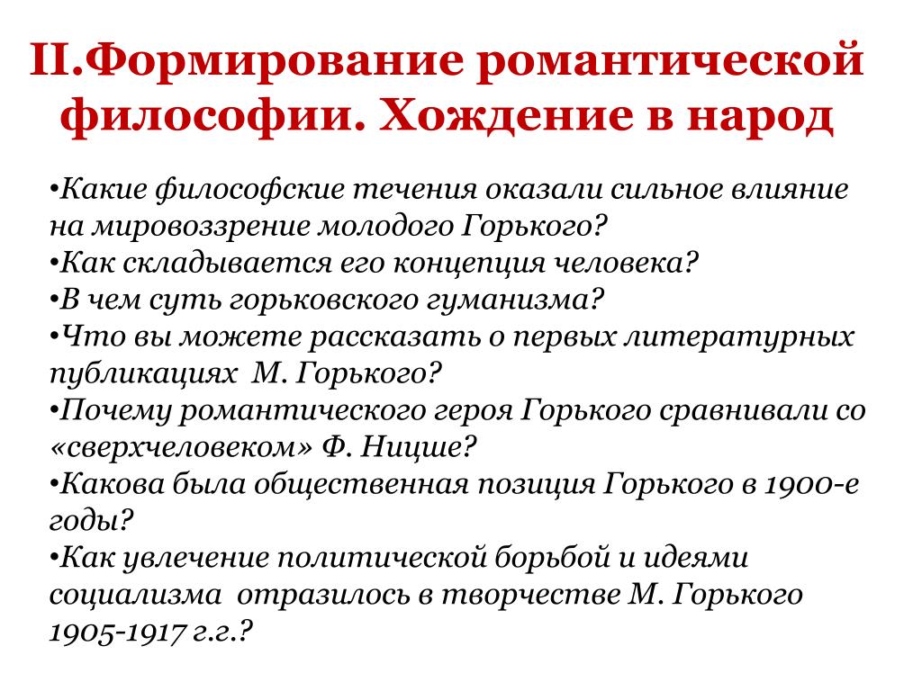 II.Формирование романтической философии. Хождение в народ • Какие философские течения оказали сильное влияние на мировоззрение молодого Горького? • Как складывается его концепция человека? • В чем суть горьковского гуманизма? • Что вы можете рассказать о первых литературных публикациях М. Горького? • Почему романтического героя Горького сравнивали со «сверхчеловеком» Ф. Ницше? • Какова была общественная позиция Горького в 1900-е годы? • Как увлечение политической борьбой и идеями социализма отразилось в творчестве М. Горького 1905-1917 г.г.?