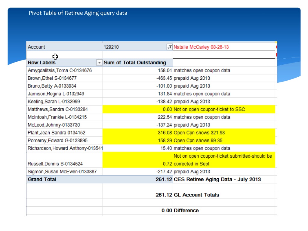 Retiree Receivable Account/129210 To reconcile 129210/Retiree receivable account use the retiree aging query, the open coupon query, the supplemental pdr detail file (from the FTP server) and the GL activity report. The retiree aging data is used to create a pivot table to balance to the GL activity. Any variances may require running the BOR_Audit_GL_Jrnl_Detail to locate any manual journals. In order to reconcile, manual journals should be reversed and rekeyed as CES online payroll adjustments. Once retiree aging is balanced to GL activity, both of these should be balanced to the Open Coupon Query data. Payments made in advance and received in the Supplemental PDR process should represent any differences in the Open Coupon Data and the Retiree Aging Data. Open Coupon Query data provides the ADP/Benedirect outstanding balances for Retirees and Cobra participants. If the 129210/Retiree receivable account has not been reconciled for an extended period of time it may be necessary to begin reconciliation using the personal services detail query and the BOR_audit_GL_Jrnl_Detail query. Substitute these two queries for the retiree aging and GL activity detail until all variances have been recognized and corrected. Use of the Personal Services Detail query may be needed to research any unidentified variances.
