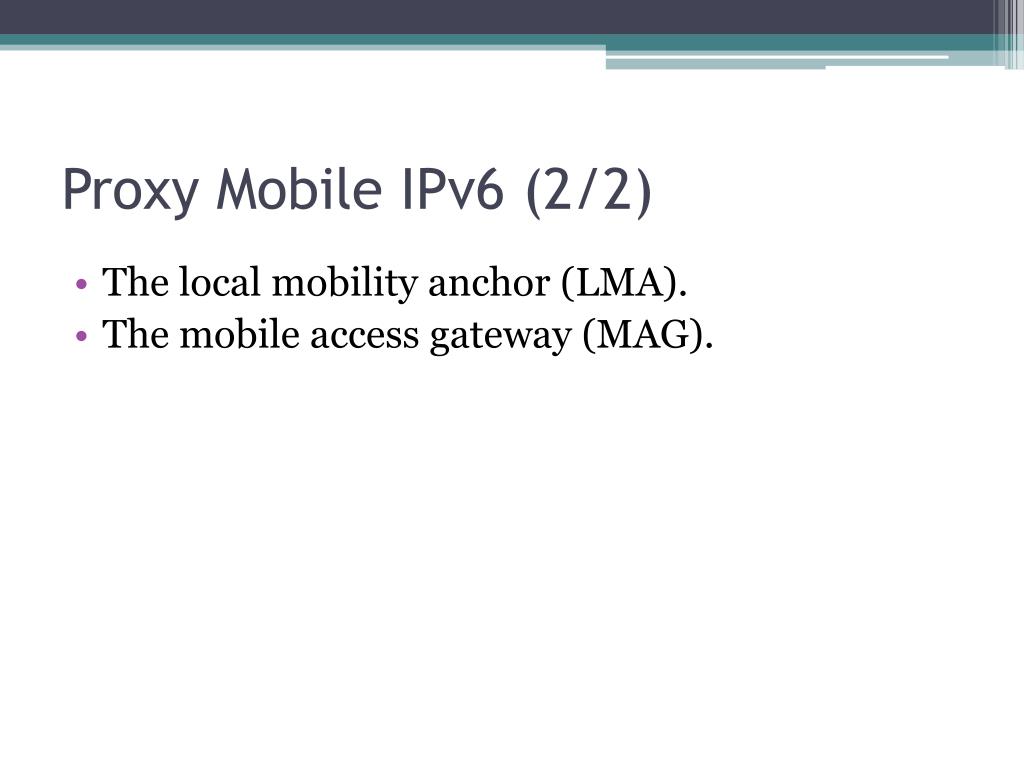 Proxy Mobile IPv6 (2/2) • The local mobility anchor (LMA). • The mobile access gateway (MAG).