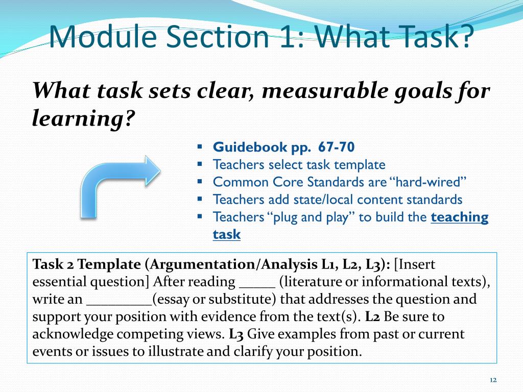 Module Section 1: What Task? What task sets clear, measurable goals for learning? • Guidebook pp. 67-70 • Teachers select task template • Common Core Standards are “hard-wired” • Teachers add state/local content standards • Teachers “plug and play” to build the teaching task Task 2 Template (Argumentation/Analysis L1, L2, L3): [Insert essential question] After reading _____ (literature or informational texts), write an _________(essay or substitute) that addresses the question and support your position with evidence from the text(s). L2 Be sure to acknowledge competing views. L3 Give examples from past or current events or issues to illustrate and clarify your position.