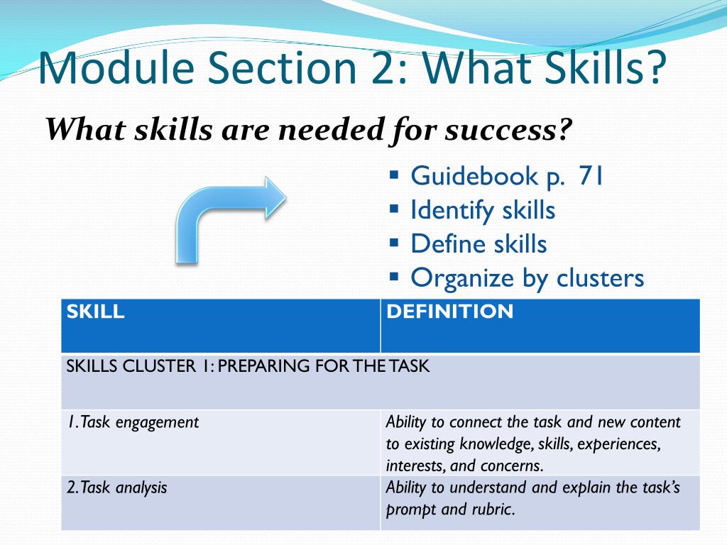 Module Section 2: What Skills? What skills are needed for success? • Guidebook p. 71 • Identify skills • Define skills • Organize by clusters