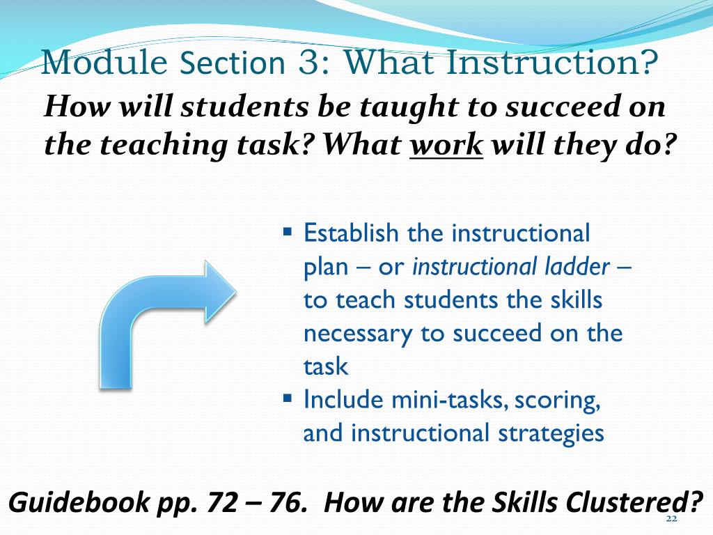 Module Section 3: What Instruction? How will students be taught to succeed on the teaching task? What work will they do? • Establish the instructional plan – or instructional ladder – to teach students the skills necessary to succeed on the task • Include mini-tasks, scoring, and instructional strategies Guidebook pp. 72 – 76. How are the Skills Clustered?