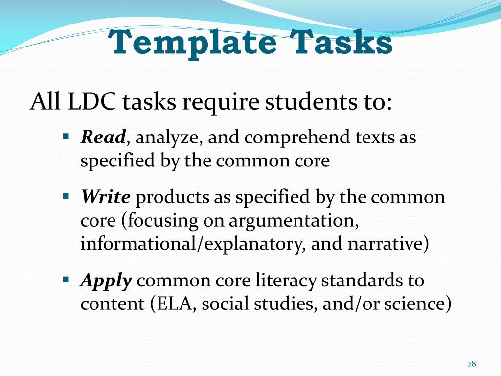 Template Tasks All LDC tasks require students to: • Read, analyze, and comprehend texts as specified by the common core • Write products as specified by the common core (focusing on argumentation, informational/explanatory, and narrative) • Apply common core literacy standards to content (ELA, social studies, and/or science)