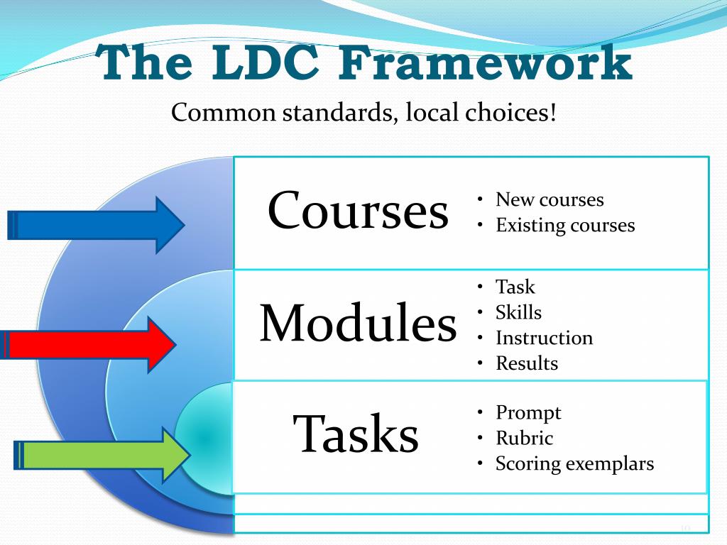The LDC Framework Common standards, local choices! • Courses • New courses • Existing courses • Modules • Task • Skills • Instruction • Results • Tasks • Prompt • Rubric • Scoring exemplars