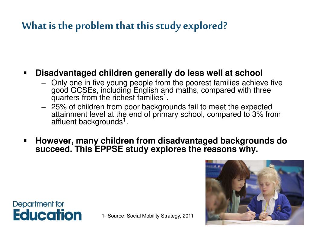 What is the problem that this study explored? • Disadvantaged children generally do less well at school • Only one in five young people from the poorest families achieve five good GCSEs, including English and maths, compared with three quarters from the richest families1. • 25% of children from poor backgrounds fail to meet the expected attainment level at the end of primary school, compared to 3% from affluent backgrounds1. • However, many children from disadvantaged backgrounds do succeed. This EPPSE study explores the reasons why. 1- Source: Social Mobility Strategy, 2011
