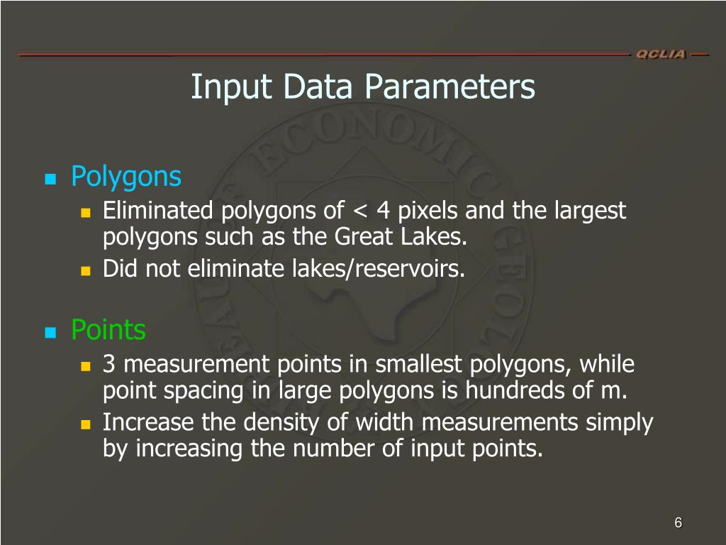 Input Data Parameters • Polygons • Eliminated polygons of < 4 pixels and the largest polygons such as the Great Lakes. • Did not eliminate lakes/reservoirs. • Points • 3 measurement points in smallest polygons, while point spacing in large polygons is hundreds of m. • Increase the density of width measurements simply by increasing the number of input points.