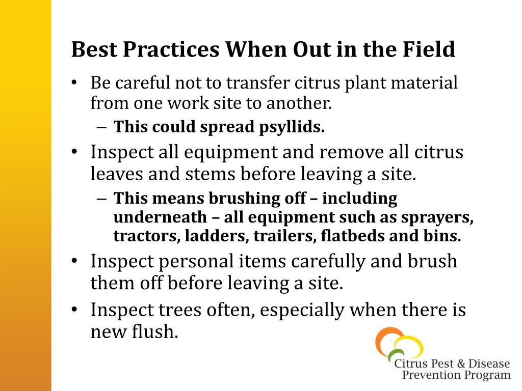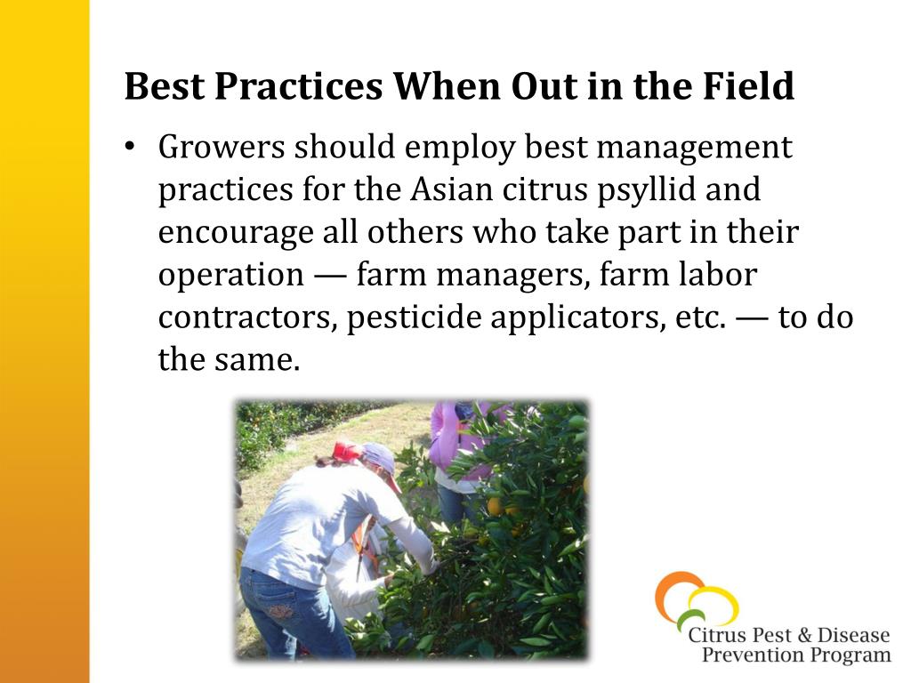 Best Practices When Out in the Field • Growers should employ best management practices for the Asian citrus psyllid and encourage all others who take part in their operation — farm managers, farm labor contractors, pesticide applicators, etc. — to do the same.