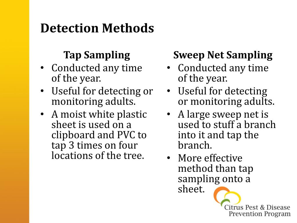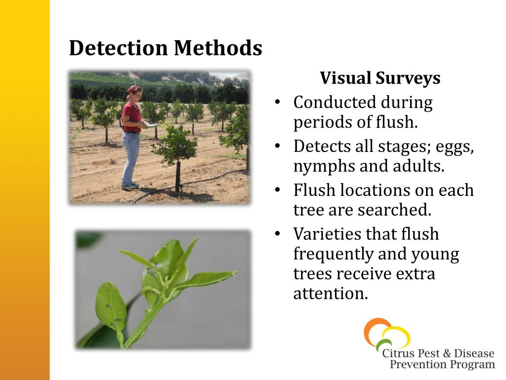 Detection Methods Visual Surveys • Conducted during periods of flush. • Detects all stages; eggs, nymphs and adults. • Flush locations on each tree are searched. • Varieties that flush frequently and young trees receive extra attention.