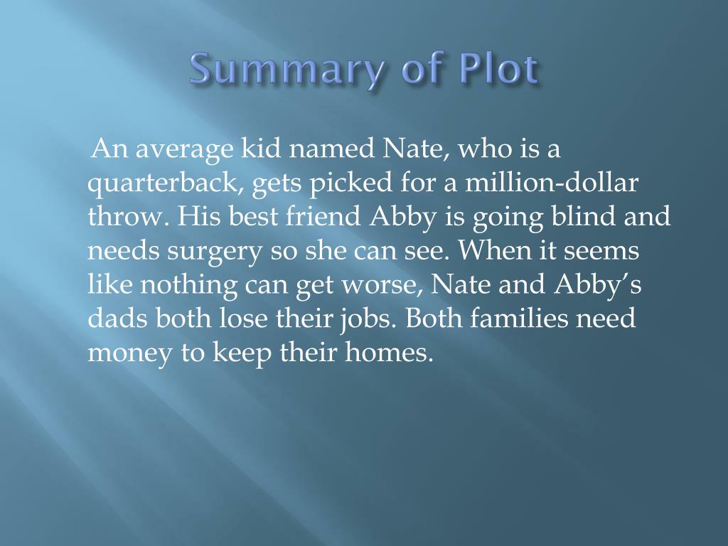 Summary of Plot An average kid named Nate, who is a quarterback, gets picked for a million-dollar throw. His best friend Abby is going blind and needs surgery so she can see. When it seems like nothing can get worse, Nate and Abby’s dads both lose their jobs. Both families need money to keep their homes.