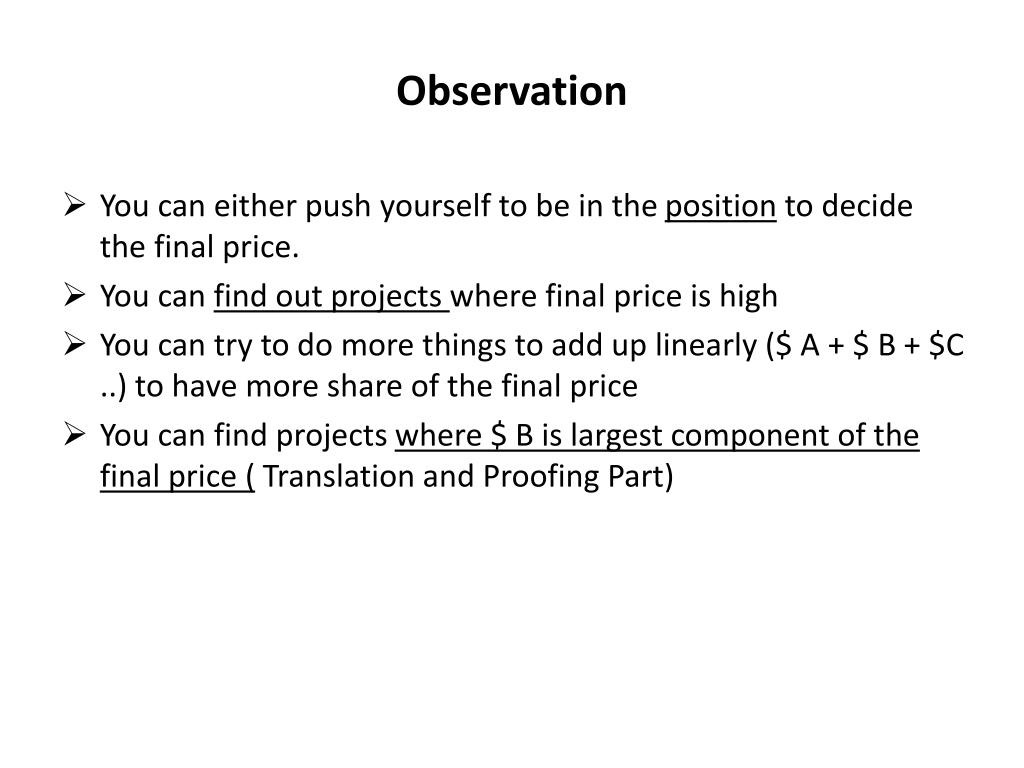 Observation • You can either push yourself to be in the position to decide the final price. • You can find out projects where final price is high • You can try to do more things to add up linearly ($ A + $ B + $C ..) to have more share of the final price • You can find projects where $ B is largest component of the final price ( Translation and Proofing Part)