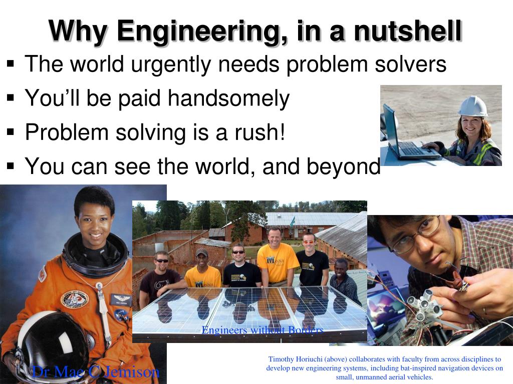 Why Engineering, in a nutshell • The world urgently needs problem solvers • You’ll be paid handsomely • Problem solving is a rush! • You can see the world, and beyond Engineers without Borders Timothy Horiuchi (above) collaborates with faculty from across disciplines to develop new engineering systems, including bat-inspired navigation devices on small, unmanned aerial vehicles. Dr Mae C Jemison