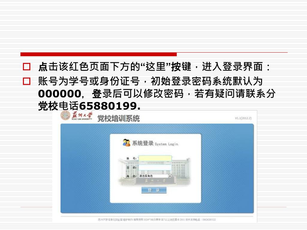 点击该红色页面下方的“这里”按键,进入登录界面:点击该红色页面下方的“这里”按键,进入登录界面: • 账号为学号或身份证号,初始登录密码系统默认为000000,登录后可以修改密码,若有疑问请联系分党校电话65880199.
