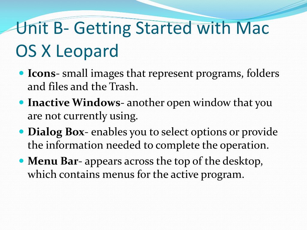 Unit B- Getting Started with Mac OS X Leopard • Icons- small images that represent programs, folders and files and the Trash. • Inactive Windows- another open window that you are not currently using. • Dialog Box- enables you to select options or provide the information needed to complete the operation. • Menu Bar- appears across the top of the desktop, which contains menus for the active program.