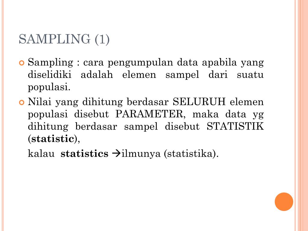 SAMPLING (1) • Sampling : cara pengumpulan data apabila yang diselidiki adalah elemen sampel dari suatu populasi. • Nilai yang dihitung berdasar SELURUH elemen populasi disebut PARAMETER, maka data yg dihitung berdasar sampel disebut STATISTIK (statistic), kalau statistics ilmunya (statistika).