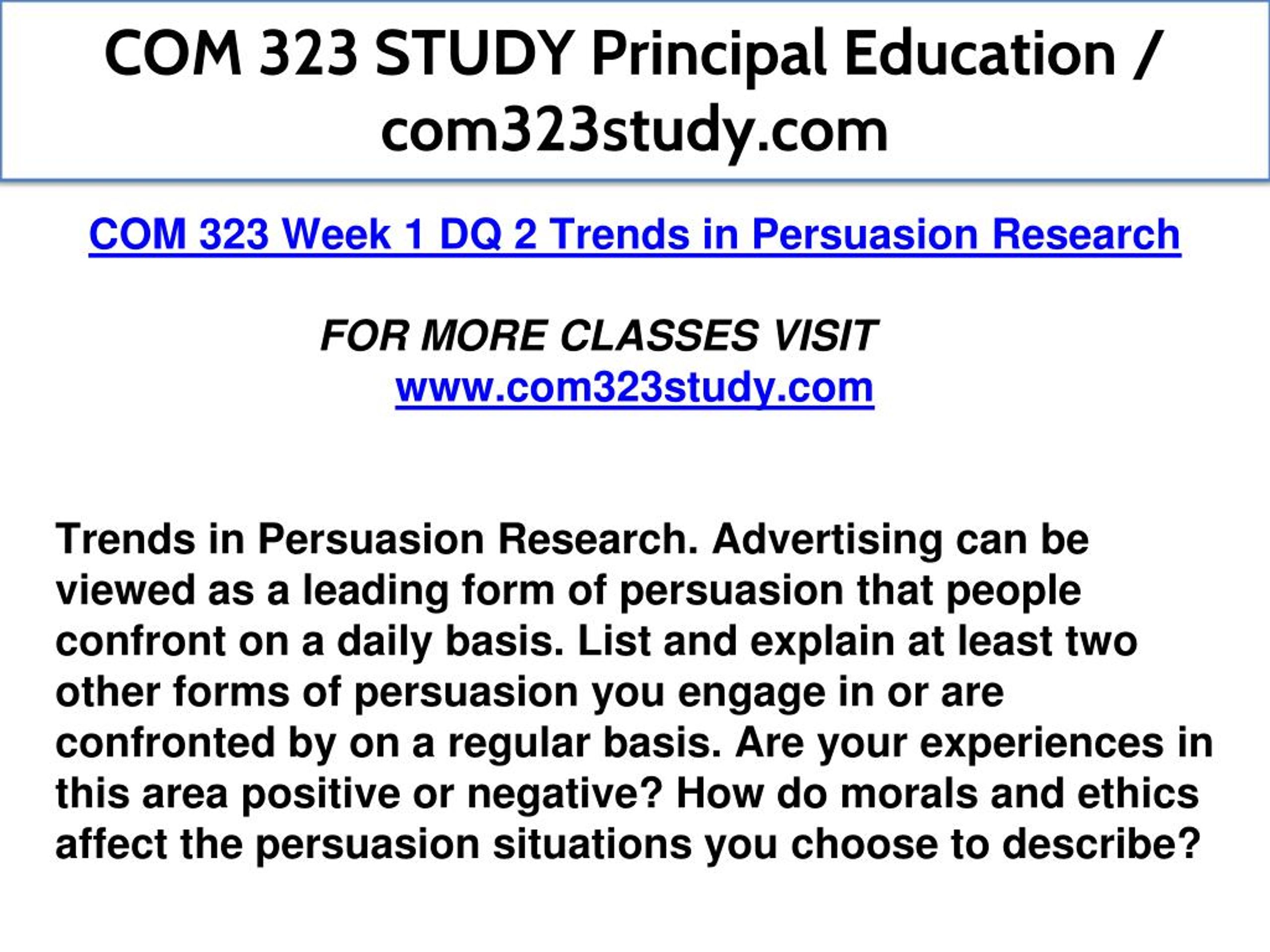 COM 323 STUDY Principal Education / com323study.com COM 323 Week 1 DQ 2 Trends in Persuasion Research FOR MORE CLASSES VISIT www.com323study.com Trends in Persuasion Research. Advertising can be viewed as a leading form of persuasion that people confront on a daily basis. List and explain at least two other forms of persuasion you engage in or are confronted by on a regular basis. Are your experiences in this area positive or negative? How do morals and ethics affect the persuasion situations you choose to describe?