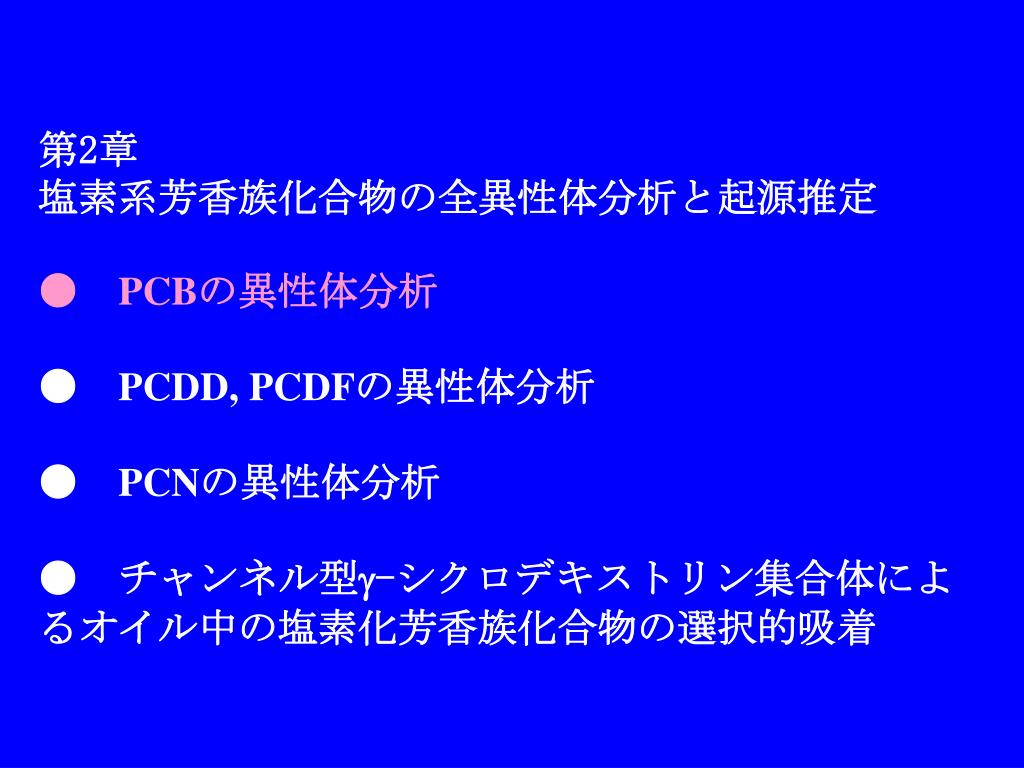 第2章 塩素系芳香族化合物の全異性体分析と起源推定 ● PCBの異性体分析 ● PCDD, PCDFの異性体分析 ● PCNの異性体分析 ● チャンネル型g-シクロデキストリン集合体によるオイル中の塩素化芳香族化合物の選択的吸着