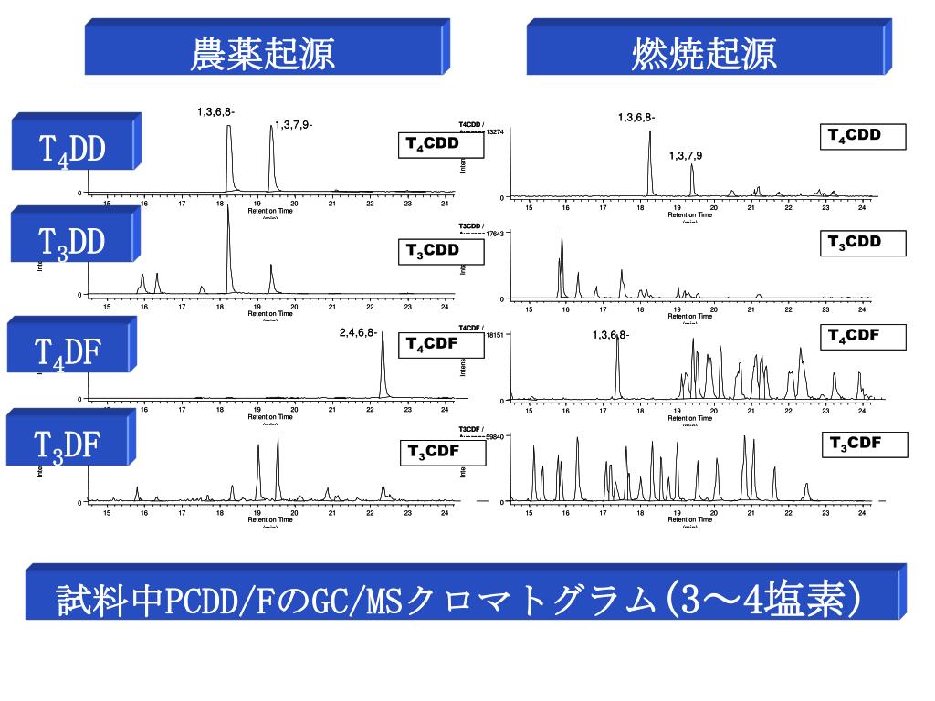 農薬起源 燃焼起源 農薬起源 燃焼起源 T4DD T3DD T4DF T3DF 試料中PCDD/FのGC/MSクロマトグラム(3~4塩素)