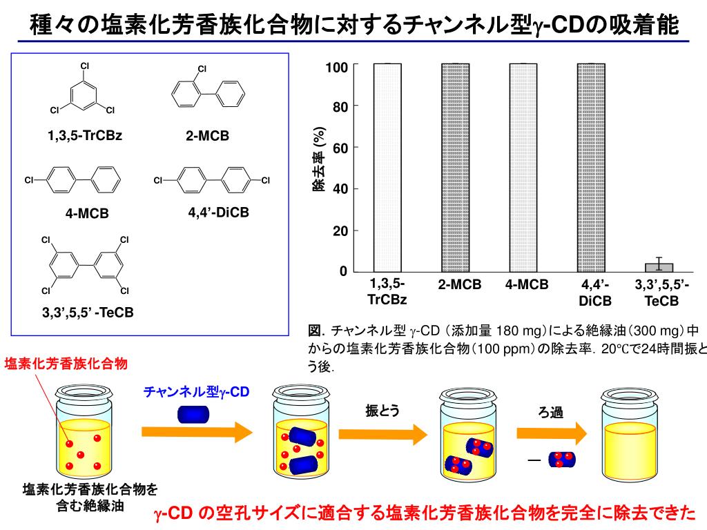 種々の塩素化芳香族化合物に対するチャンネル型g-CDの吸着能種々の塩素化芳香族化合物に対するチャンネル型g-CDの吸着能 100 80 1,3,5-TrCBz 2-MCB 除去率 (%) 60 40 4,4’-DiCB 4-MCB 20 0 1,3,5- TrCBz 2-MCB 4-MCB 4,4’- DiCB 3,3’,5,5’- TeCB 3,3’,5,5’ -TeCB 図.チャンネル型 g-CD (添加量 180 mg)による絶縁油(300 mg)中からの塩素化芳香族化合物(100 ppm)の除去率.20℃で24時間振とう後. 塩素化芳香族化合物 チャンネル型g-CD 振とう ろ過 - 塩素化芳香族化合物を 含む絶縁油 g-CD の空孔サイズに適合する塩素化芳香族化合物を完全に除去できた