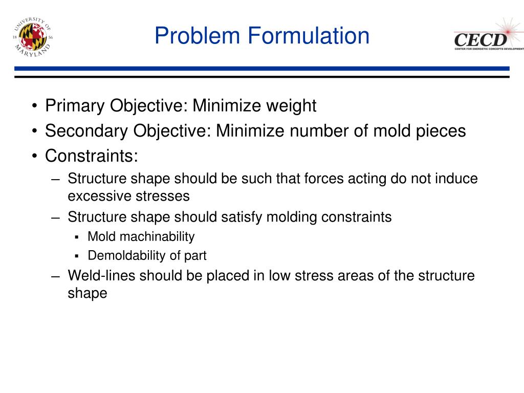 Problem Formulation • Primary Objective: Minimize weight • Secondary Objective: Minimize number of mold pieces • Constraints: • Structure shape should be such that forces acting do not induce excessive stresses • Structure shape should satisfy molding constraints • Mold machinability • Demoldability of part • Weld-lines should be placed in low stress areas of the structure shape
