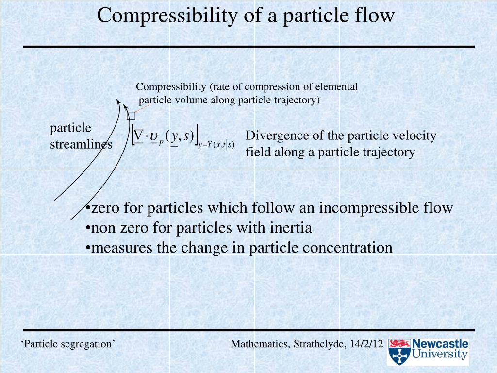 particle streamlines Compressibility of a particle flow Compressibility (rate of compression of elemental particle volume along particle trajectory) Divergence of the particle velocity field along a particle trajectory • zero for particles which follow an incompressible flow • non zero for particles with inertia • measures the change in particle concentration ‘Particlesegregation’ Mathematics, Strathclyde, 14/2/12