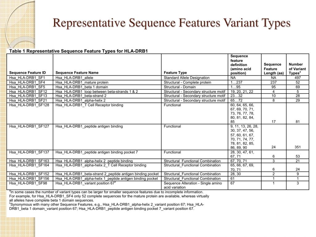 Summary of SFVT approach • Define individual sequence features (SF) in HLA proteins (genes) • Determine the extent of polymorphism for each sequence feature by defining the observed variant types (VT) • Re-annotate HLA typing information with complete list of VT for each SF • Examine the association between every sequence feature variant type and disease or other phenotype