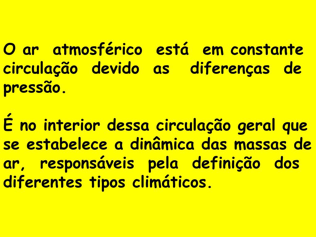 O ar atmosférico está em constante circulação devido as diferenças de pressão. É no interior dessa circulação geral que se estabelece a dinâmica das massas de ar, responsáveis pela definição dos diferentes tipos climáticos.