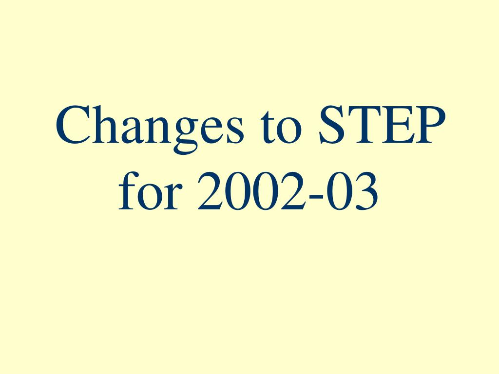 Timeline • Schools should begin adding new data now using a copy of the 2001-02 file • Manual and first version of the software will be available in early May • Final STEP 2002-03 software will be available in June