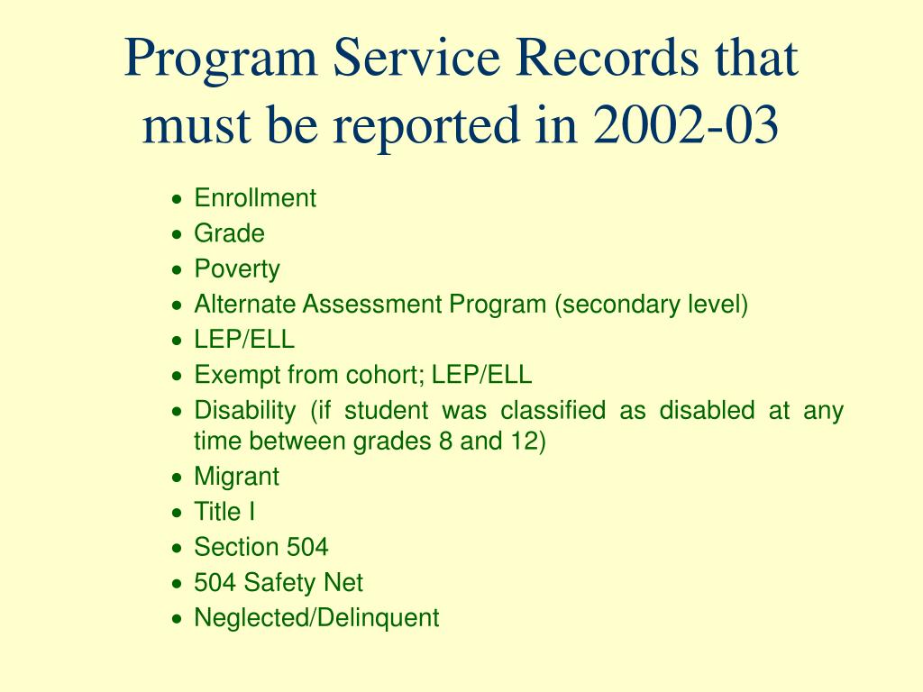 Program Service Records that must be reported in 2002-03 • Enrollment • Grade • Poverty • Alternate Assessment Program (secondary level) • LEP/ELL • Exempt from cohort; LEP/ELL • Disability (if student was classified as disabled at any time between grades 8 and 12) • Migrant • Title I • Section 504 • 504 Safety Net • Neglected/Delinquent