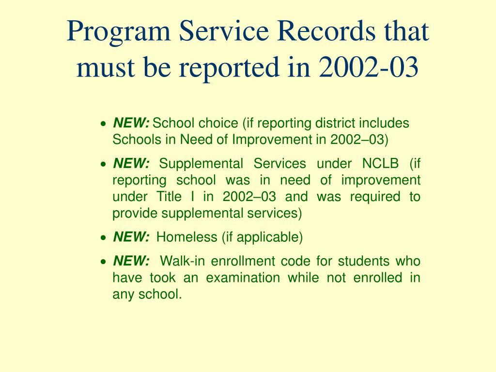 Program Service Records that must be reported in 2002-03 • NEW: School choice (if reporting district includes Schools in Need of Improvement in 2002–03) • NEW: Supplemental Services under NCLB (if reporting school was in need of improvement under Title I in 2002–03 and was required to provide supplemental services) • NEW: Homeless (if applicable) • NEW: Walk-in enrollment code for students who have took an examination while not enrolled in any school.