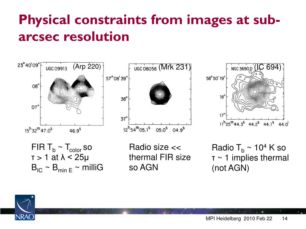 Physical constraints from images at sub-arcsec resolution (Arp 220) (Mrk 231) (IC 694) FIR Tb ~ Tcolorso τ > 1 at λ < 25μ BIC ~ Bmin E ~ milliG Radio size << thermal FIR size so AGN Radio Tb ~ 104 K so τ ~ 1 implies thermal (not AGN) MPI Heidelberg 2010 Feb 22
