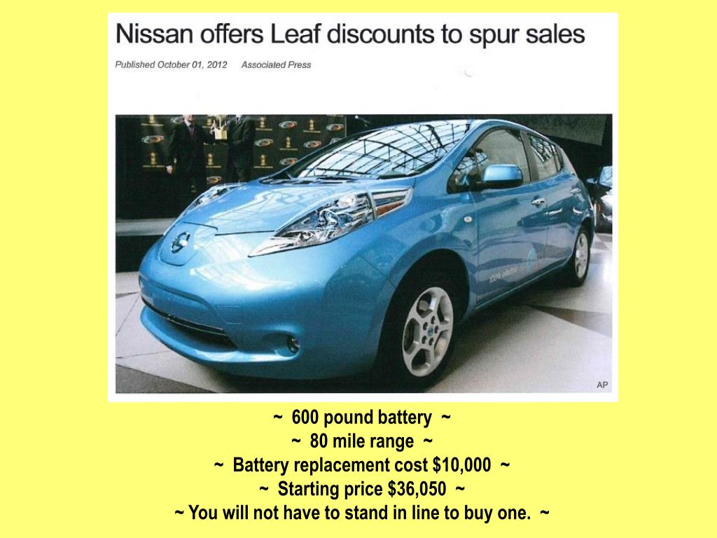 ~ 600 pound battery ~ ~ 80 mile range ~ ~ Battery replacement cost $10,000 ~ ~ Starting price $36,050 ~ ~ You will not have to stand in line to buy one. ~
