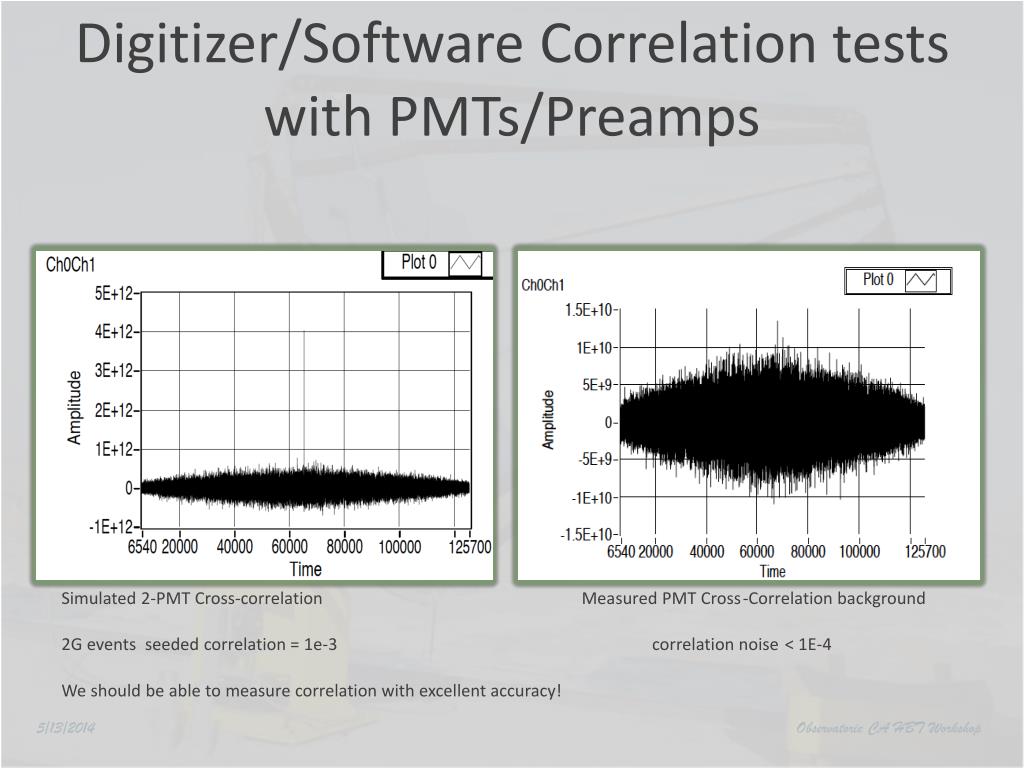 Digitizer/Software Correlationtests with PMTs/Preamps Simulated Single PMT Measured Single PMT AutoCorrelationAutoCorrelation Observatorie CA HBT Workshop