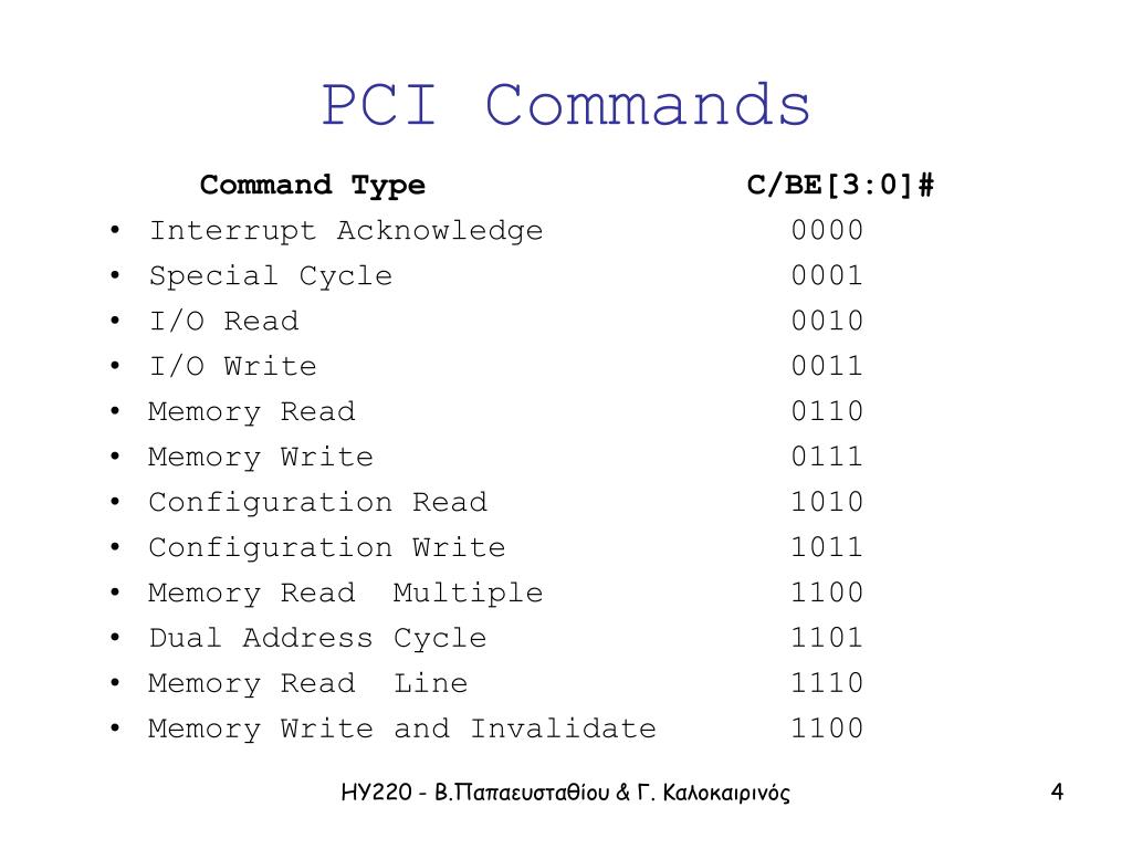 PCI Commands Command Type C/BE[3:0]# • Interrupt Acknowledge 0000 • Special Cycle 0001 • I/O Read 0010 • I/O Write 0011 • Memory Read 0110 • Memory Write 0111 • Configuration Read 1010 • Configuration Write 1011 • Memory Read Multiple 1100 • Dual Address Cycle 1101 • Memory Read Line 1110 • Memory Write and Invalidate 1100 ΗΥ220 - Β.Παπαευσταθίου & Γ. Καλοκαιρινός