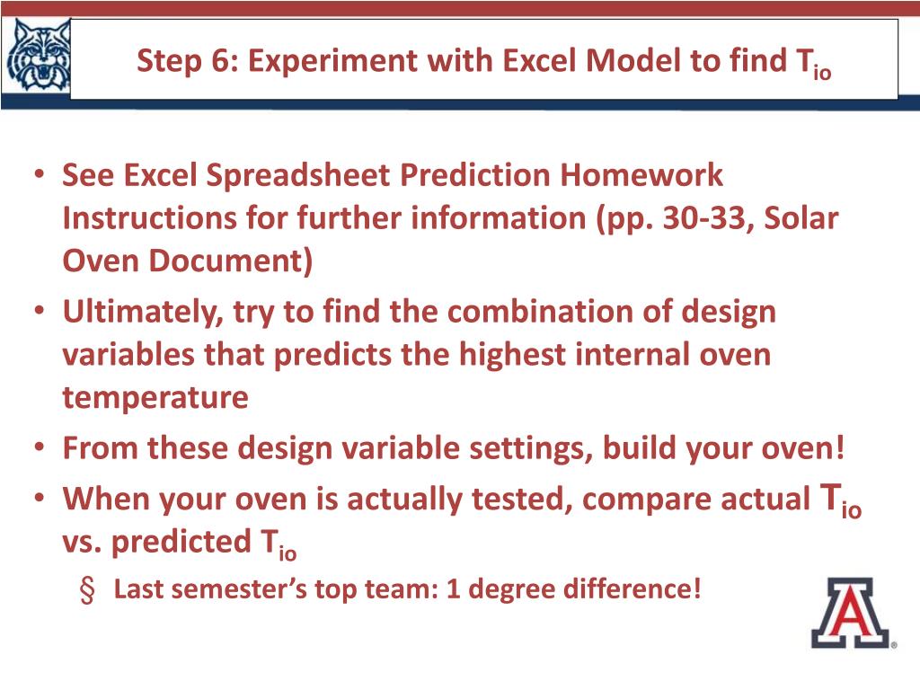 Step 6: Experiment with Excel Model to find Tio • See Excel Spreadsheet Prediction Homework Instructions for further information (pp. 30-33, Solar Oven Document) • Ultimately, try to find the combination of design variables that predicts the highest internal oven temperature • From these design variable settings, build your oven! • When your oven is actually tested, compare actual Tio vs. predicted Tio • Last semester’s top team: 1 degree difference!
