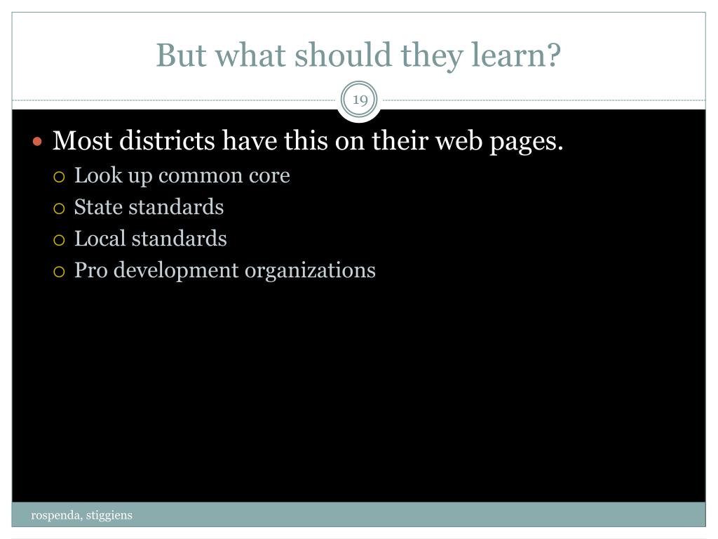 But what should they learn? • Most districts have this on their web pages. • Look up common core • State standards • Local standards • Pro development organizations rospenda, stiggiens