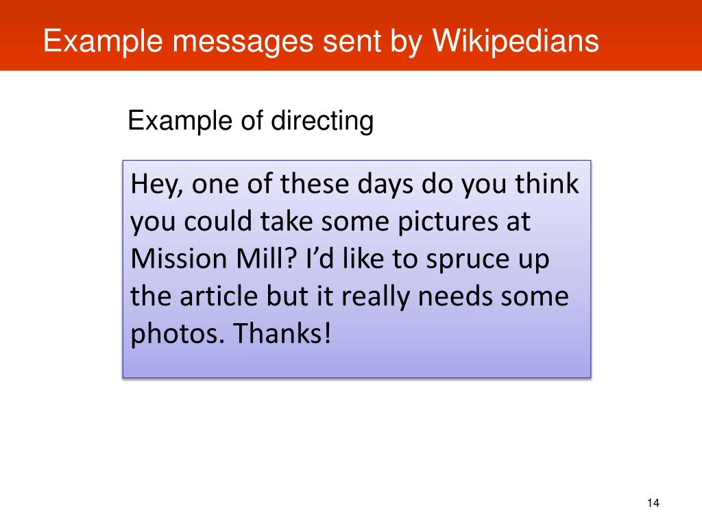 Example messages sent by Wikipedians Hey, one of these days do you think you could take some pictures at Mission Mill? I’d like to spruce up the article but it really needs some photos. Thanks! Example of directing