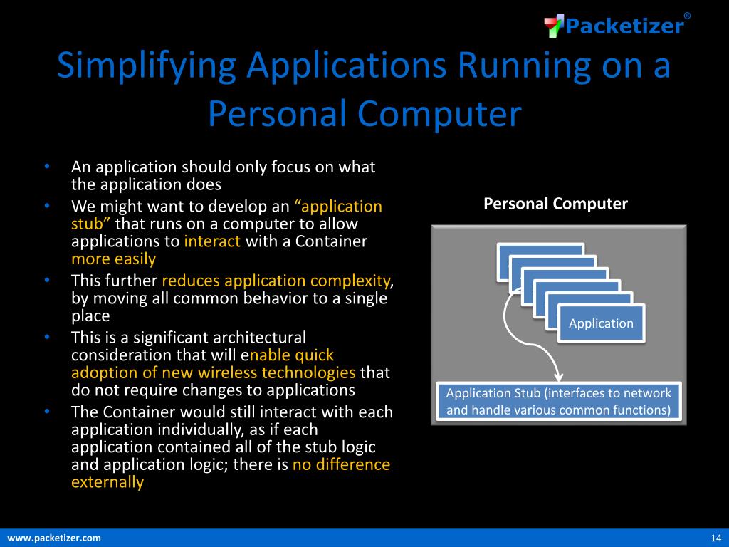 Simplifying Applications Running on a Personal Computer • An application should only focus on what the application does • We might want to develop an “application stub” that runs on a computer to allow applications to interact with a Container more easily • This further reduces application complexity, by moving all common behavior to a single place • This is a significant architectural consideration that will enable quick adoption of new wireless technologies that do not require changes to applications • The Container would still interact with each application individually, as if each application contained all of the stub logic and application logic; there is no difference externally Personal Computer Application Application Application Application Application Application Application Stub (interfaces to network and handle various common functions)