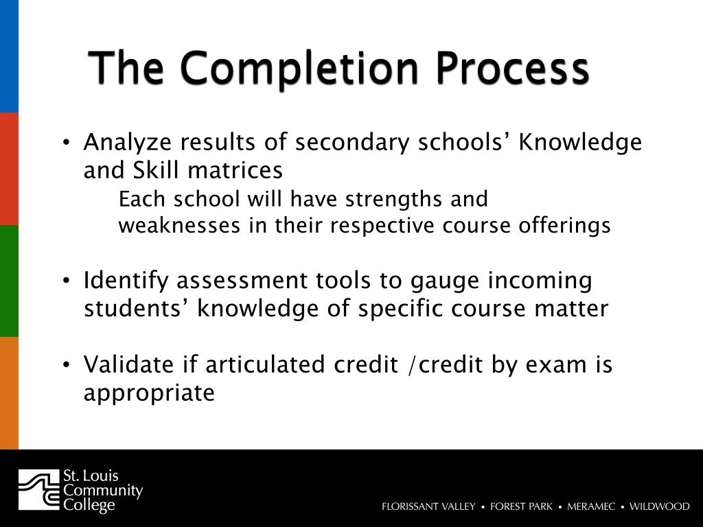 The Completion Process Analyze results of secondary schools’ Knowledge and Skill matrices Each school will have strengths and weaknesses in their respective course offerings Identify assessment tools to gauge incoming students’ knowledge of specific course matter Validate if articulated credit /credit by exam is appropriate