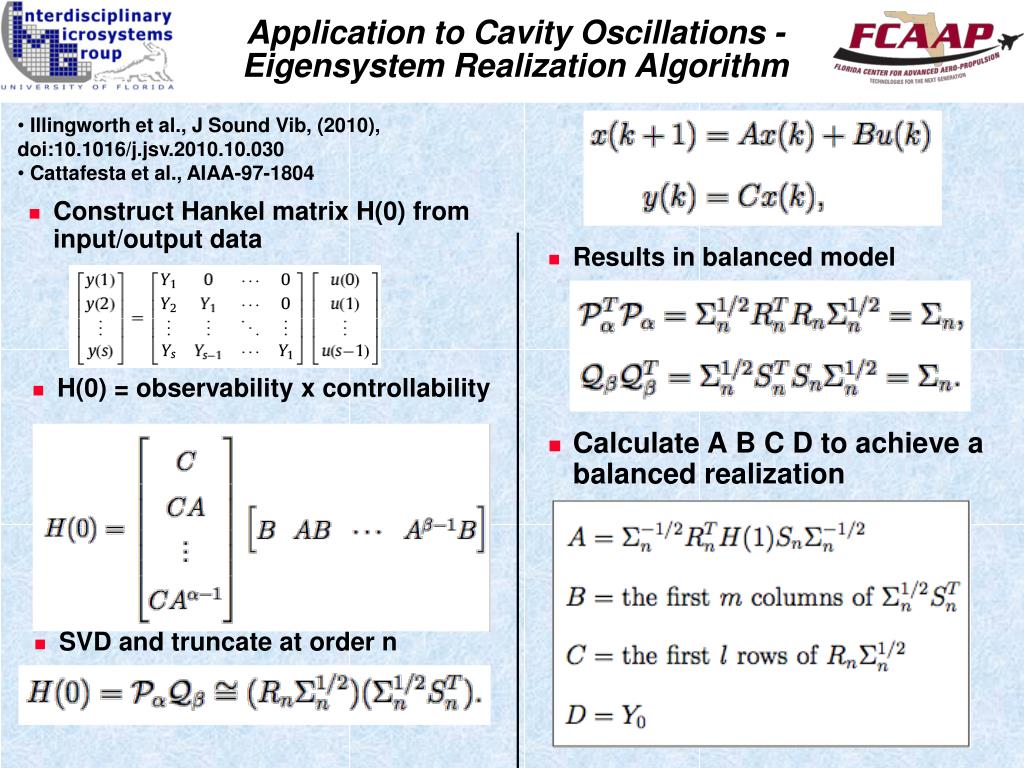 Application to Cavity Oscillations -Eigensystem Realization Algorithm • Illingworth et al., J Sound Vib, (2010), doi:10.1016/j.jsv.2010.10.030 • Cattafesta et al., AIAA-97-1804 • Construct Hankel matrix H(0) from input/output data • Results in balanced model • H(0) = observability x controllability • Calculate A B C D to achieve a balanced realization • SVD and truncate at order n
