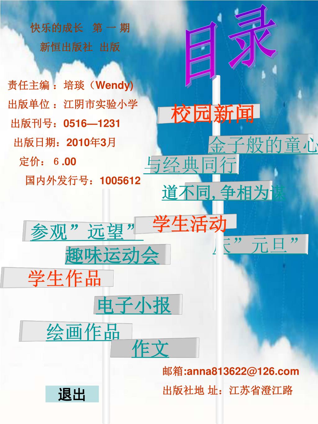 快乐的成长 第 一 期 新恒出版社 出版 责任主编 :培琰(Wendy) 出版单位 :江阴市实验小学 出版刊号:0516—1231 出版日期:2010年3月 定价:6.00 国内外发行号:1005612 目录 校园新闻 金子般的童心 与经典同行 道不同,争相为谋 学生活动 参观”远望” 庆”元旦” 趣味运动会 学生作品 电子小报 绘画作品 作文 邮箱:anna813622@126.com 出版社地 址:江苏省澄江路 退出