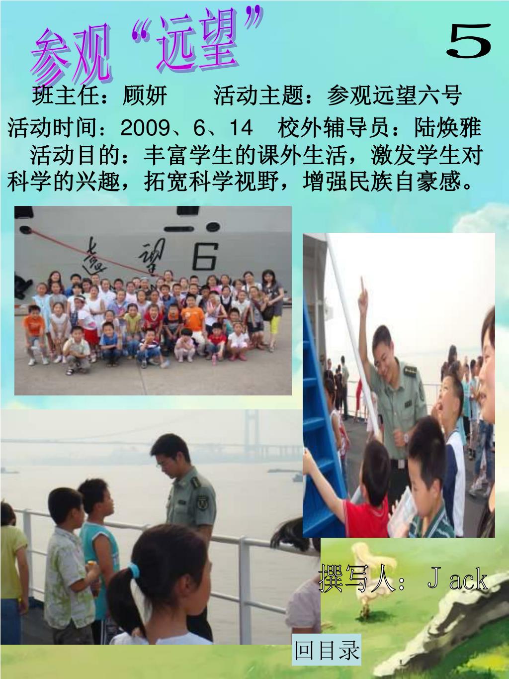 参观“远望” 5 班主任:顾妍 活动主题:参观远望六号 活动时间:2009、6、14 校外辅导员:陆焕雅 活动目的:丰富学生的课外生活,激发学生对科学的兴趣,拓宽科学视野,增强民族自豪感。 撰写人:Jack 回目录