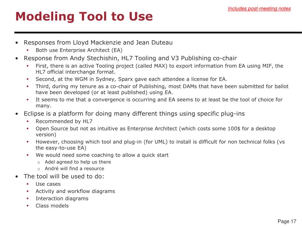 Includes post-meeting notes Modeling Tool to Use • Responses from Lloyd Mackenzie and Jean Duteau • Both use Enterprise Architect (EA) • Response from Andy Stechishin, HL7 Tooling and V3 Publishing co-chair • First, there is an active Tooling project (called MAX) to export information from EA using MIF, the HL7 official interchange format. • Second, at the WGM in Sydney, Sparx gave each attendee a license for EA. • Third, during my tenure as a co-chair of Publishing, most DAMs that have been submitted for ballot have been developed (or at least published) using EA. • It seems to me that a convergence is occurring and EA seems to at least be the tool of choice for many. • Eclipse is a platform for doing many different things using specific plug-ins • Recommended by HL7 • Open Source but not as intuitive as Enterprise Architect (which costs some 100$ for a desktop version) • However, choosing which tool and plug-in (for UML) to install is difficult for non technical folks (vs the easy-to-use EA) • We would need some coaching to allow a quick start • Adel agreed to help us there • André will find a resource • The tool will be used to do: • Use cases • Activity and workflow diagrams • Interaction diagrams • Class models