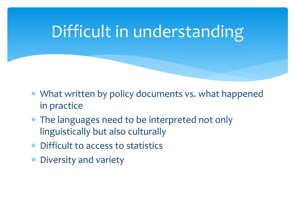 Difficult in understanding What written by policy documents vs. what happened in practice The languages need to be interpreted not only linguistically but also culturally Difficult to access to statistics Diversity and variety