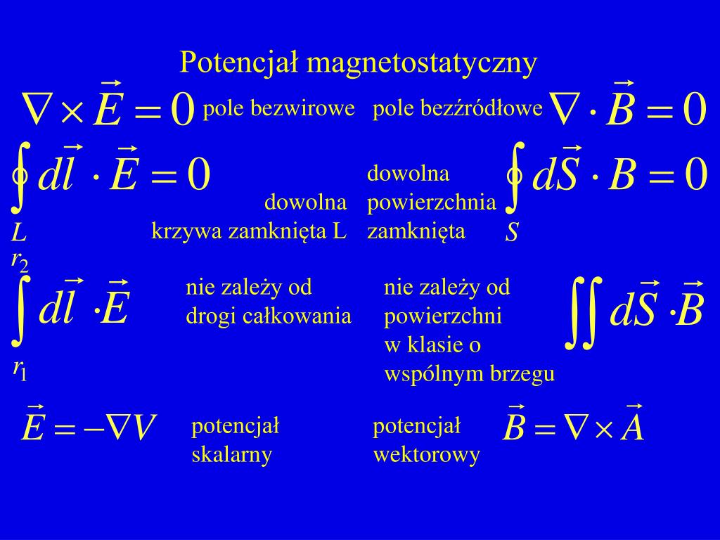 Potencjał magnetostatyczny pole bezwirowe pole bezźródłowe dowolna powierzchnia zamknięta dowolna krzywa zamknięta L nie zależy od drogi całkowania nie zależy od powierzchni w klasie o wspólnym brzegu