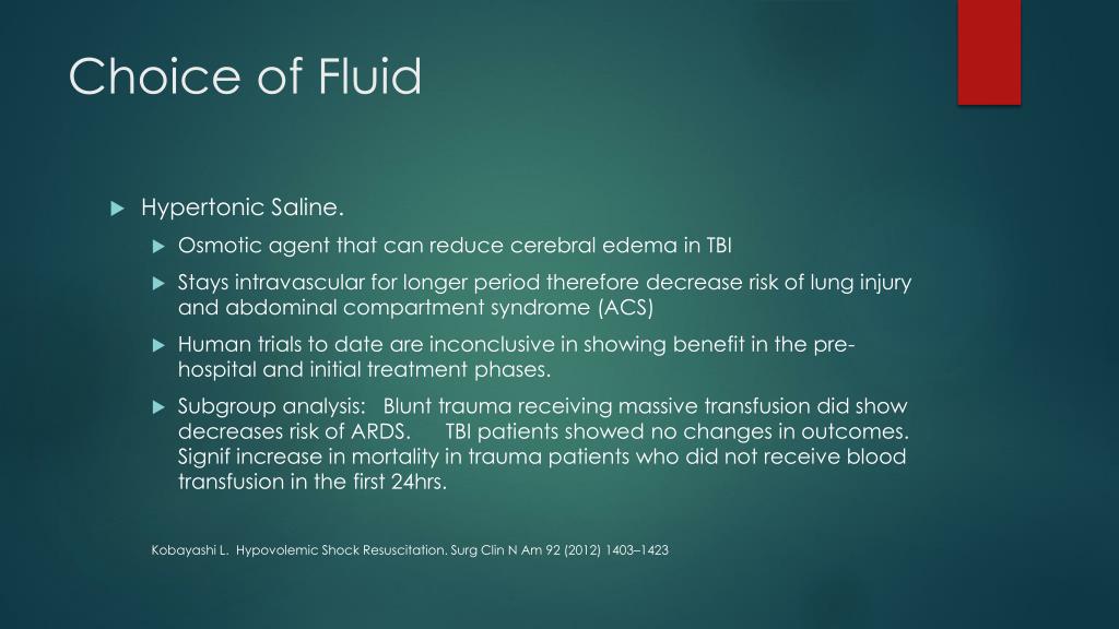 Choice of Fluid • Hypertonic Saline. • Osmotic agent that can reduce cerebral edema in TBI • Stays intravascular for longer period therefore decrease risk of lung injury and abdominal compartment syndrome (ACS) • Human trials to date are inconclusive in showing benefit in the pre-hospital and initial treatment phases. • Subgroup analysis: Blunt trauma receiving massive transfusion did show decreases risk of ARDS. TBI patients showed no changes in outcomes. Signif increase in mortality in trauma patients who did not receive blood transfusion in the first 24hrs. Kobayashi L. Hypovolemic Shock Resuscitation. SurgClin N Am 92 (2012) 1403–1423